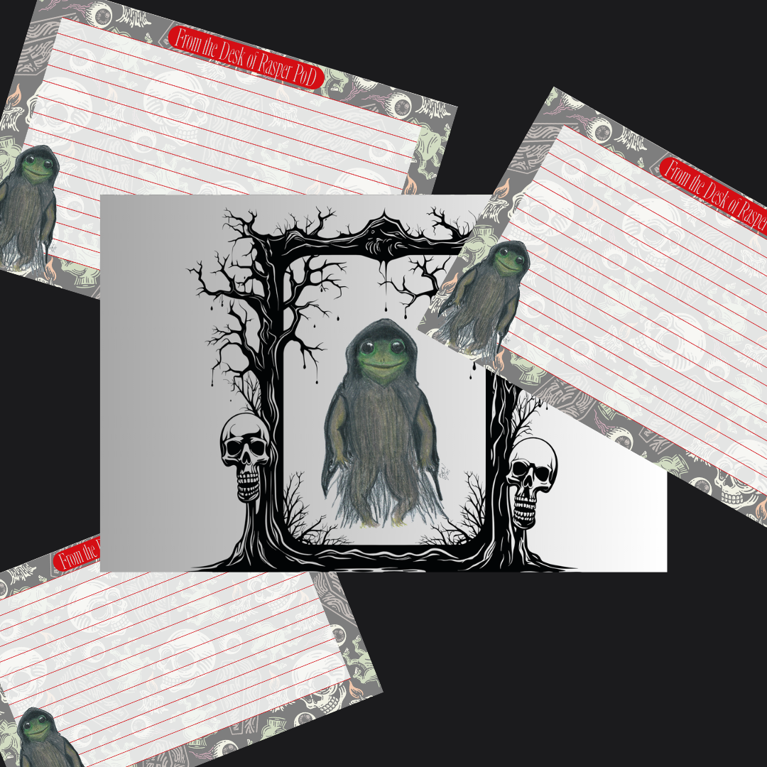 Step into the quirky, macabre world of Rasper PoD, the frog reaper whose desk invites your notes, secrets, and spells. This 40-page notepad features a full-color, hand-drawn character on the glossy cover, while each sheet inside provides a playful yet dark canvas for your thoughts.