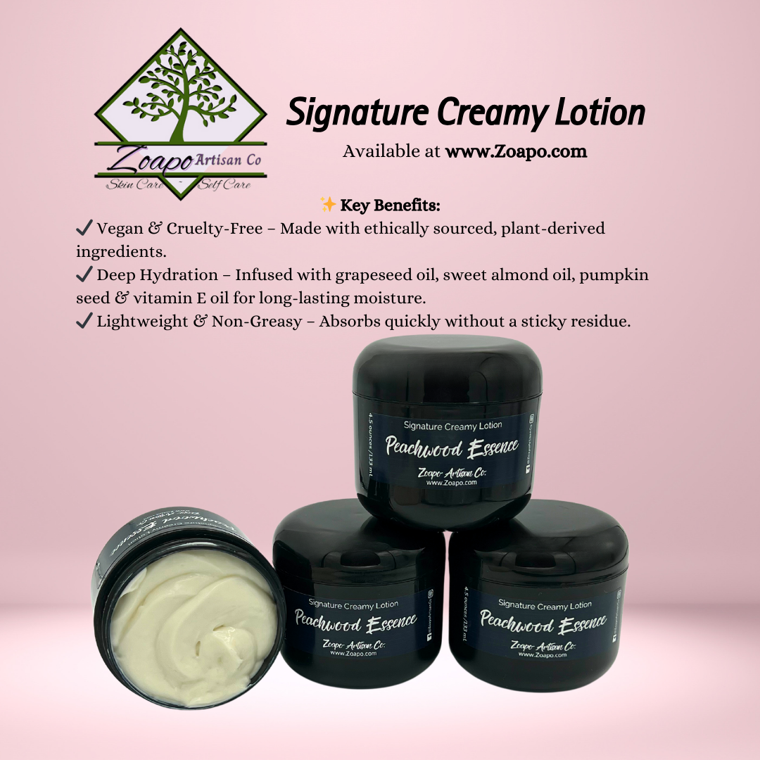 Indulge your skin in rich, plant-powered hydration with our Signature Lotion, infused with the warm, sophisticated scent of Peachwood Essence. This ultra-nourishing, vegan formula blends skin-loving botanicals for deep moisture and a velvety-soft finish.