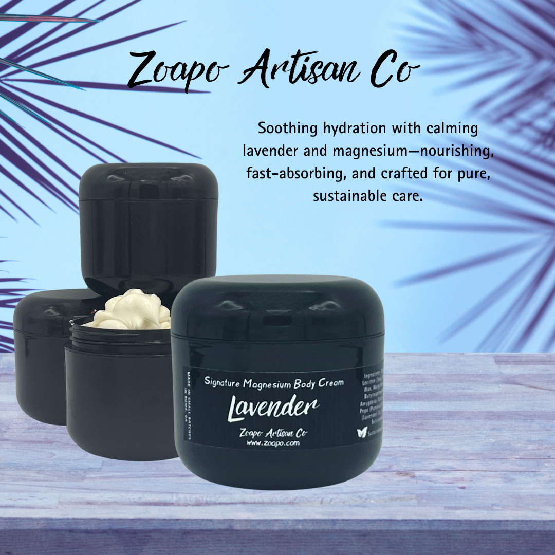 Magnesium Body Cream combines many moisturizing ingredients along with magnesium oil and Lavender Essential Oil to give your body all the help it needs after a long hard day. Lavender helps relax the senses and magnesium is said to help relieve aches and pains in the muscles in joints. We created this formula with ingredients that will feel luxurious on your skin while helping your body and mind too.